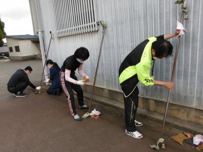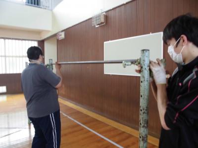 職員で鉄棒についていた錆を落とし,体育館に設置しました。