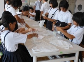 6年生は,科学や算数の楽しさを味わいながら,4月から入学する中学校で,他校の6年生や先生方と交流もできました。体験ブースでは,「綿菓子づくり」「スライムづくり」「タングラムで脳トレ」「正多面体の展開図づくり」などに挑戦しました。夏休みの楽しい思い出の一つになりました。