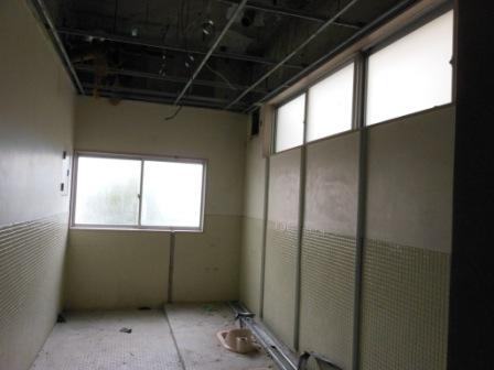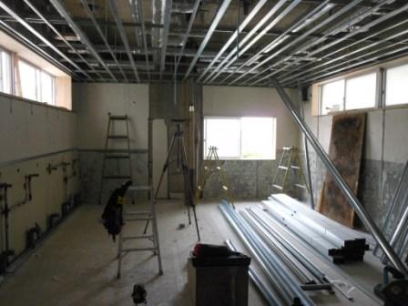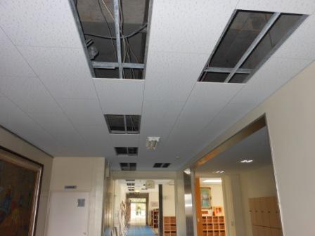 体育館天井の照明がLEDに取りかえられました。以前のものよりコンパクトになっています。以前の照明は,天井よりつりさげられていましたが,LEDは,天井に設置されており,すっきりしています。トイレは,すっかり前の形がなくなっており,これから新しいトイレの設置が始まりそうです。教室のエアコンも順次設置されています。(エアコンの使用は今年度は難しそうです)