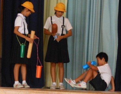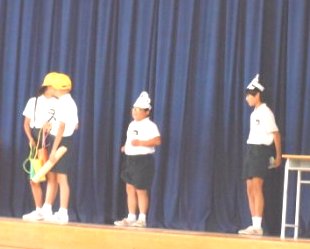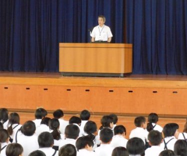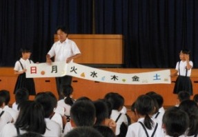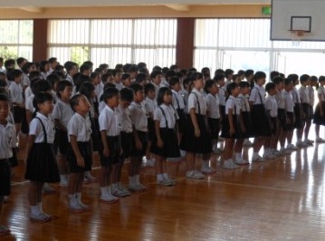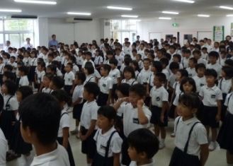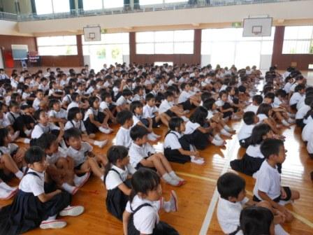 終業式に先立ち,先日の県小学生陸上競技大会において,入賞した2名の伝達表彰式をしました。全校児童による校歌斉唱のあと,校長のお話,児童代表の夏休みの抱負,保健委員会による熱中症の演劇,生徒指導主事のお話と続きましたが,児童は真剣にお話を聴いていました。