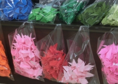 今日は,夏休みに入って20日目,全校登校日。昨日までの猛暑は少し落ち着きましたが,それでも,暑い一日でした。9時から1階ランチルームで,平和集会が行われました。まず,思わず耳をふさぐくらいの大きな声で校歌を歌いました。そして,縦割り班ごとに折り紙で鶴を折りました。6年生が1年生に折り方を教えるほほえましい場面も見られました。次に,4年生が国語の授業で作成した平和本のショ―ウインドーを発表してくれました。そして,運営委員会による「へいわってすてきだね」詩の朗読がありました。最後に,「折り鶴」の歌を全員で歌いました。