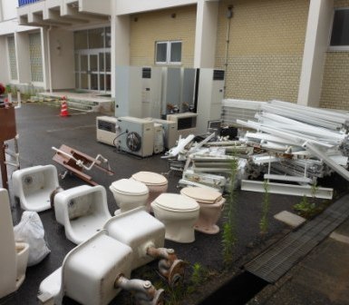 校舎内工事も,どんどん進んでいます。体育館前には,廃棄された物が並べられていました。今日まで,ありがとう!校舎内には,これから設置される備品が届いています。これからおろしくお願いします!来年の夏休みは,空調の整った教室で快適にサマースクールができます。
