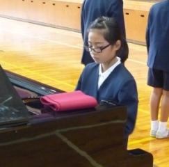 発表集会の後半。3年生は,津波の被害を防ぐことができた釜石の奇跡で有名な釜石小学校の校歌について発表しました。その歌詞の意味の大きさを伝えてくれました。全校音楽では,「上を向いて歩こう」を合奏しました。各学級で朝の歌の時間に練習してきたものを揃えて演奏しました。とても素敵な演奏となりました。次に,4年生の発表は,国語や総合で勉強してきた「福祉」について,発表した後,よさこいを披露しました。躍動感があり,圧巻でした。最後に,6年生が環境教育で学んだことを劇と合唱で表現しました。これまで,下級生の模範となるようにとがんばってきた6年生でしたが,最後もしっかりと締めてくれました。