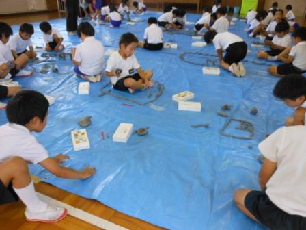 1年生が,図工の時間に,プレイルームにシートを広げて,思う存分粘土の製作に取り掛かりました。一人でパン・ケーキを作ったり,グループで未来の町を作ったり,楽しくのびのびと活動できました。