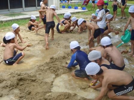 夏を思わせる暑さの中,1年生が砂場で泥遊びを楽しみました。