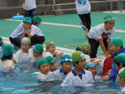 めっきり朝晩は涼しくなってきました。プールの出番もラストとなってきました。最後の水泳の授業は,着衣水泳です。重たくて泳ぎづらい体験をしました。また,ペットボトルにつかまって浮くという体験もしました。