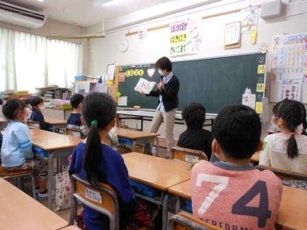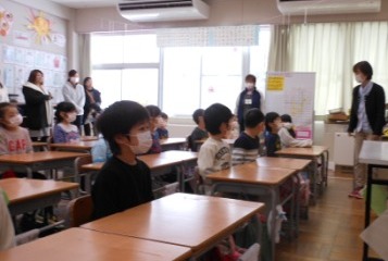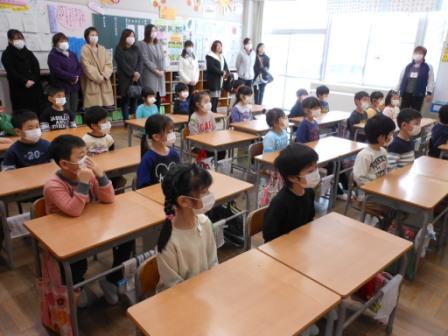 保育園との連携事業の一つとして,今年度から,年長児さんの1年教室での授業体験が実施されました。初めて入る教室で,チャイムとともに授業開始。名前を呼ばれて大きな声で返事をして,読み聞かせや鉛筆の持ち方,線を引く練習など小学校の授業を体験しました。お母さん,お父さんが見守る中,緊張感もあって,真剣に授業を受けることができました。2ヶ月後の入学が楽しみになってくれたらいいですね。