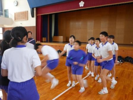 全校で,1組(赤団・黄団)対2組(白団・青団)という形で,クラスごとに8の字とびに挑戦しました。