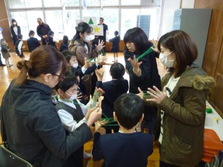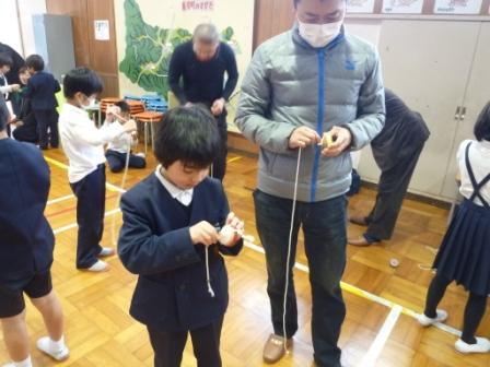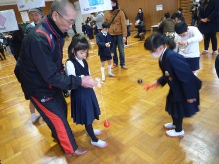 今年度最後の土曜授業がありました。1年生は,お父さんお母さん,おじいちゃん,おばあちゃんが先生となって,いろいろな昔遊びに挑戦しました。ケン玉,竹とんぼ,おはじき,お手玉,あやとり,こま回し・・・初めてさわるものもあり,最初はうまくできませんでしたが,コツを教わり,少ずつできるようになり,楽しく遊ぶことができました。