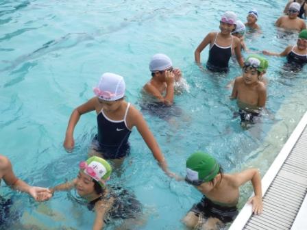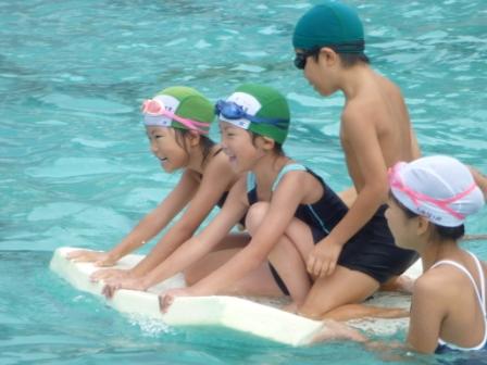 なかよしプールがありました。5年生のお兄さんとお姉さんがお世話してくれて、一緒にせんたくきをしたり、浮島リレーをしたりしました。