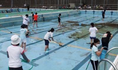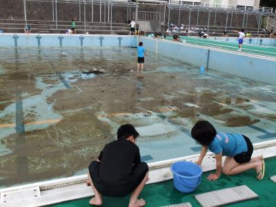 4・5・6年生が協力し,プール掃除をしました。また3年生の児童数名もプールサイドの枯葉を拾ってくれました。その結果、初めはドロドロだったプールもみんなの力を合わせてとてもきれいになりました。