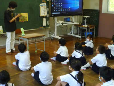 1年生は,おばけが出てくるお話「ゾクゾクおばけのがっこうたんけん」「ガンピーさんのふなあそび」を聞いたり,ボランティアの方とのやり取りを楽しんだりしました。