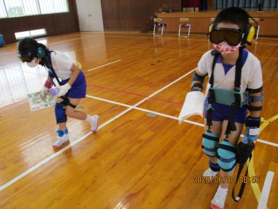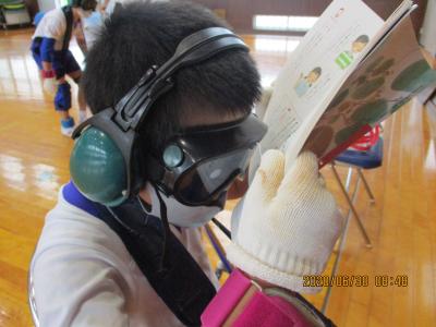 4年生の総合的な学習の時間では、「福祉」をテーマに学習をしています。今回は、社会福祉協議会の方をお招きして、高齢者疑似体験を行いました。