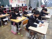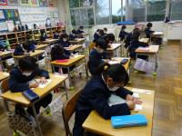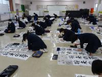 3学期が始まり,子ども達が元気に登校してきました。始業式では,「目標,トライする,学習の総まとめ,次の学年の準備」の話がありました。また,生徒指導面では,生活習慣を整えること,相談BOXの設置について,学習面では,花まる学習用具チェックと学習がんばろうポイントについての話がありました。始業式後,各教室で書初めを行いました。シーンと静まり返った教室で緊張感をもって書初めを書いていました。廊下に掲示された書初めからは練習した様子がたくさん伝わってきました。