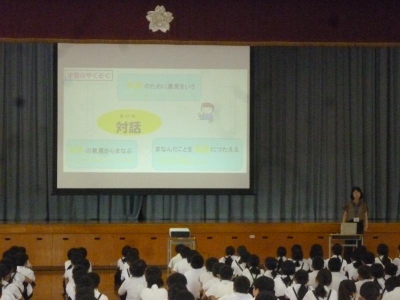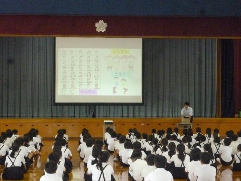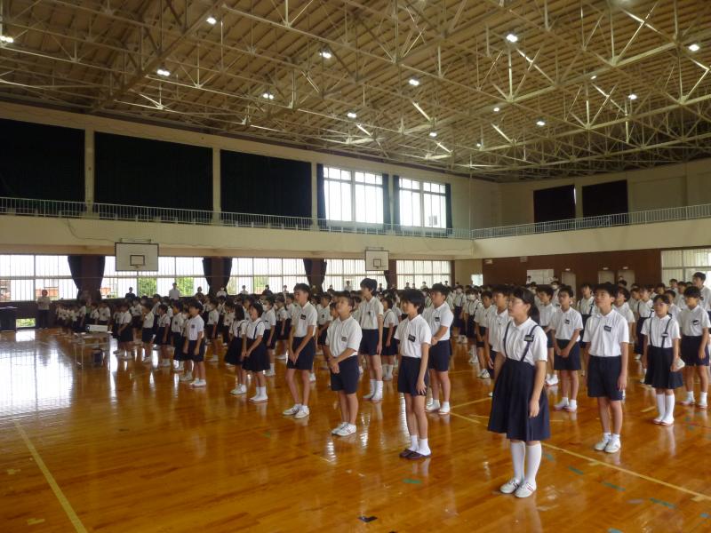 始業式は,熱中症に気をつけながら体育館で行いました。校長先生のお話に次いで,生活,学習,新しい先生とお友達の紹介についてのお話を聞きました。