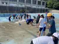 3~6年生でプール掃除をしました。最初,「きたなーい」と言っていた子ども達も,見違えるほど美しくなったプールを見て,「頑張ってよかった。」と達成感に溢れていました。今年もみんなのおかげで楽しいプール学習になりそうです。