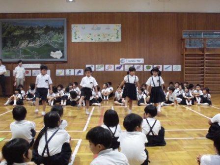 本校では,4月から外国語(英語)活動の研究をしてきました。英語で話すことに慣れてきて,楽しく授業をしています。中間発表ということで,低学年,中学年,高学年に分かれて,英語の集会をしました。低学年では,全身を使ったいろいろなエクササイズをいsました。中学年では,ビンゴでI like~を使って,動物などの英単語を学びました。高学年では,英語の絵本の読み聞かせに挑戦しました。楽しく活動でき,10月27日(金)の研究発表会も楽しみになってきました。