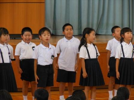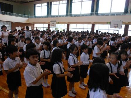 元気よい校歌で集会が始まりました。始業式の時は少し元気がないかなと思われましたが,今日は,とても大きな声が出ていました。代表委員による9月の生活目標の発表のあと,図書委員会による「ビブリオ・バトル」の本の紹介が行われました。3つの班に分かれて,それぞれが工夫して本の紹介をし,会場の児童の拍手の大きさで順位を競いました。どの班も大きな声で,本の紹介をしました。これで,ますます図書の貸し出しが増えそうです。1年生による詩の群読もありました。