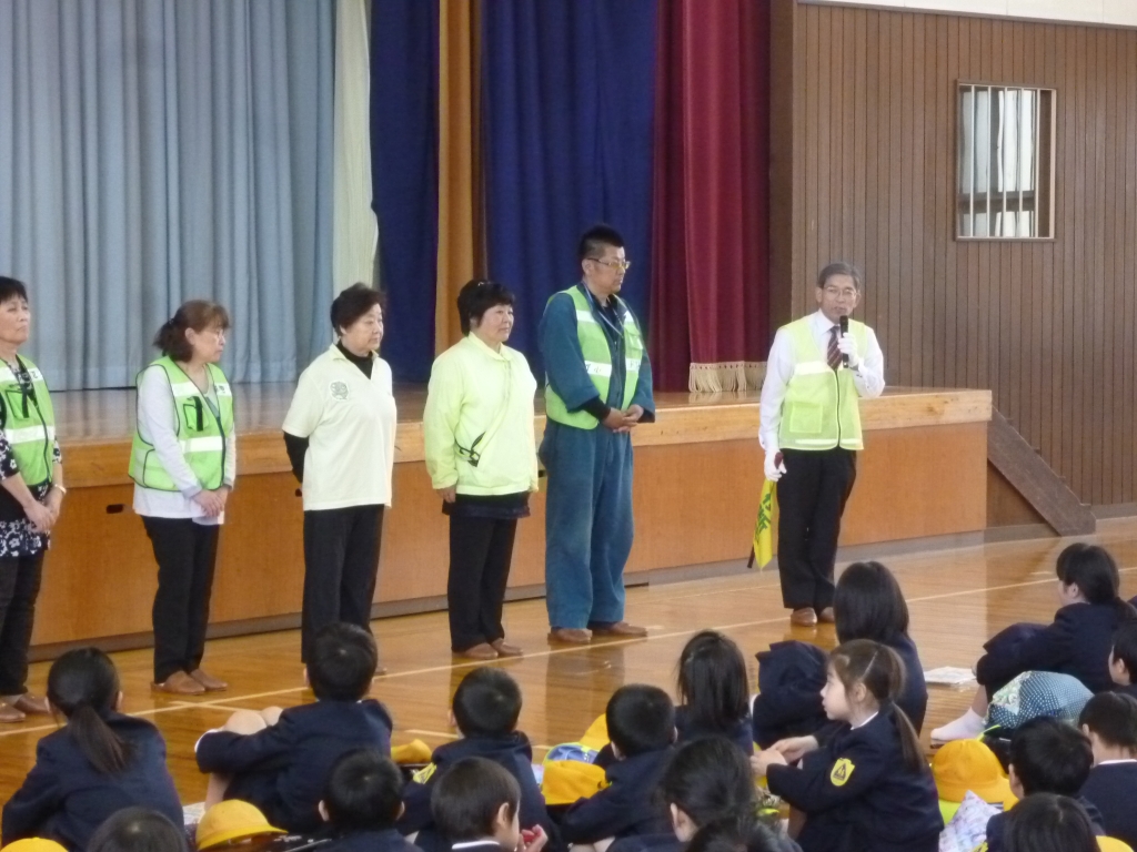 下校前に,にっこにこ組の方々をはじめ,安全パトロール隊のみなさんの紹介式を行いました。