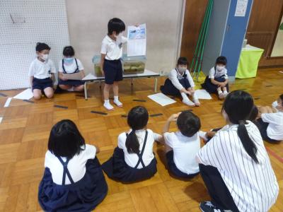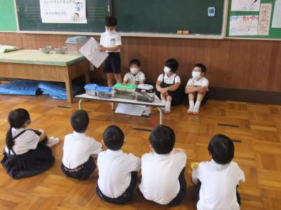 生活科でお世話していた生きものについて,国語の「かんさつ名人になろう」の学習の時に観察記録を書き,1年生に向けて発表しました。緊張しながらも一生懸命がんばりました。近くで生きものを見ることができて,1年生も楽しんでくれていました。