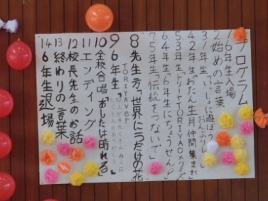 2月24日(金)の午後,6年生を送る会が開かれました。今までいろいろとお世話をしてくれた6年生のお兄さん,お姉さんたちに感謝の気持ちを伝えようと,各学年で考えた出し物を披露しました。6年生入場の後,開会式が行われました。運営は,5年生です。1年生は,詩の群読と6年生とのジャンケンおんぶリレーです。2年生は,お誕生日仲間集まれとカントリロードの合唱です。3年生は,ダンス,クイズに写真立てのプレゼントです。6年生も自然と笑顔が溢れていました。