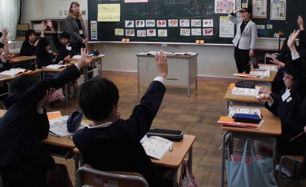 昨年度から英語に親しんでいる5年生。"Do you like ~?" "Yes,I do. No,I'dont."と 英語で友だちの好きなものを楽しみながら尋ねていました。