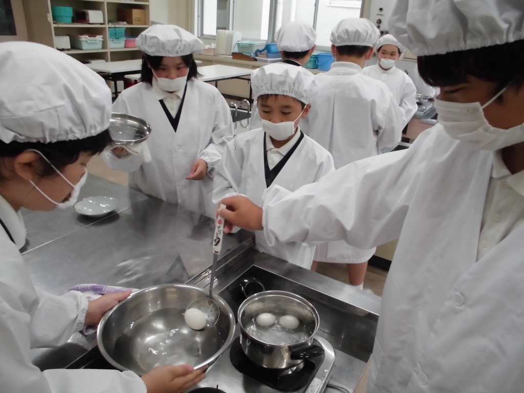 「ゆでる」ことを学ぶ時間で,班ごとにゆで卵を作り,全体で青菜のゆで方も学習しました。ふり返りには,「家でも作ってみたいです!」という意見が多くありました。