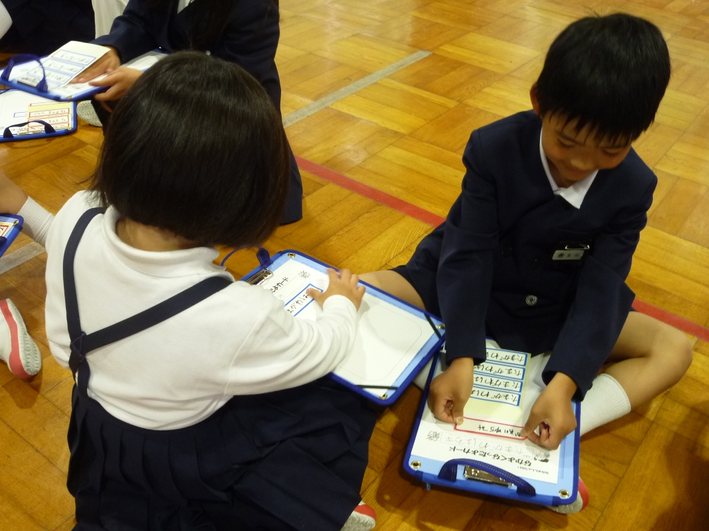 少しお兄さんお姉さんになった2年生!1年生と仲良くなることをめあてにお互いに自己紹介をしたりゲームをしたりして楽しみました。