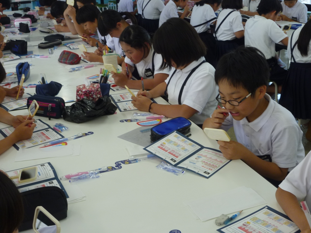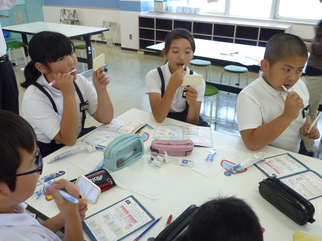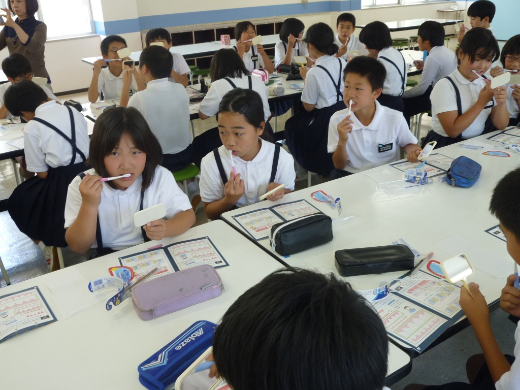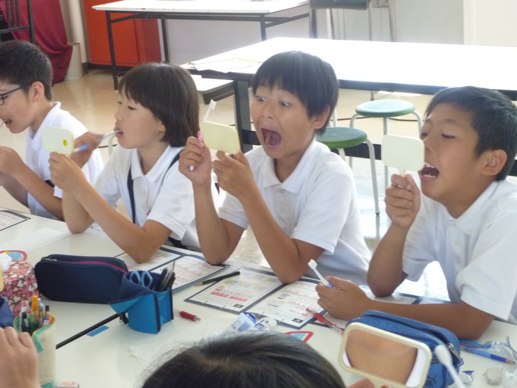 6月4日(月)の3限目に,5年生が全国小学生歯みがき大会に参加しました。DVDを見ながら,自分の歯茎の状態を確認したり,正しい歯みがきの仕方を学んだりしました。みんな真剣な表情で,自分の歯を磨いていました。自分の歯をこれからも大切にしようという意識をもつことができました。
