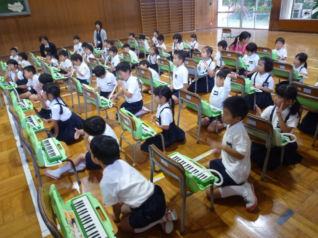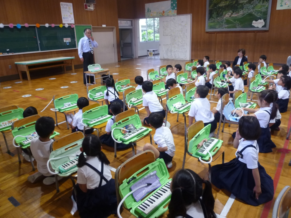 鍵盤ハーモニカの置き方や唄口のくわえ方,「ド」の位置などを教えていただき,子どもたちは「早く吹きたい」とやる気満々!これからの音楽の学習が楽しみですね。