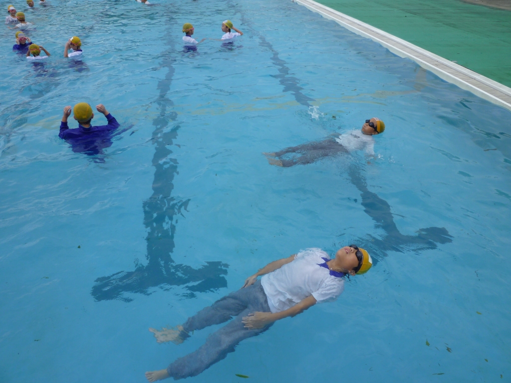 子どもたちは,いつものプールとは違う感覚を確かめながら,大の字で背浮きを行ったり,ペットボトルを抱えて浮いたりする練習を行いました。着衣水泳後のふり返りでは,「いつもよりも泳ぎにくい感じがよく分かりました。」「服が重たくて,いつもより動きにくかったです。」など,普段のプールと比べながら,考えて活動することができました。