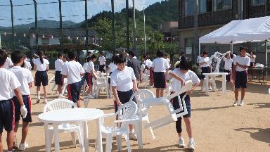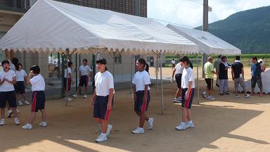 これは中学生と地域の人たちで協力してテントを組み立てているところです。