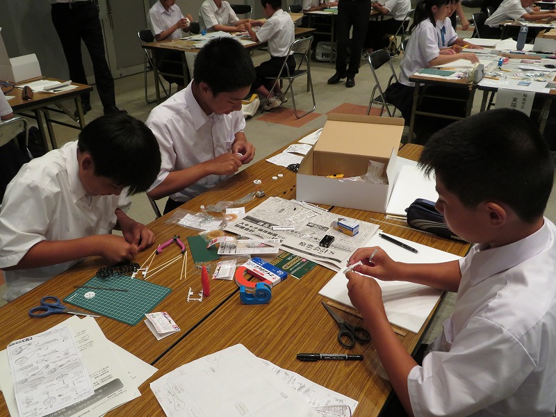 生徒たちは真剣に課題の風力推進車を作っていました。