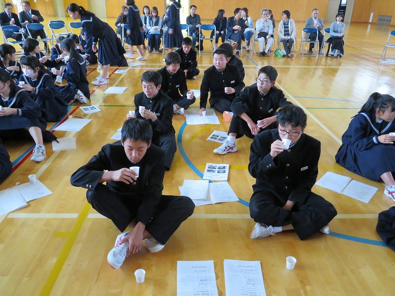 昆布とかつおぶしの出汁を入れて作ったみそ汁の2種類を保護者の皆様も含め、