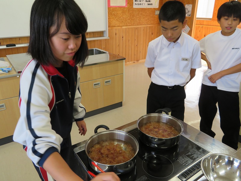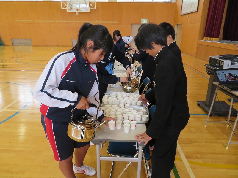 給食・情報委員会の生徒が出汁をとり、みそ汁を作りました。