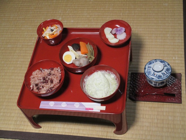 輪島塗りのお膳にきれいに盛り付け、みんなで会食しました。