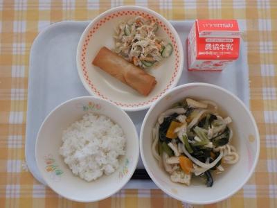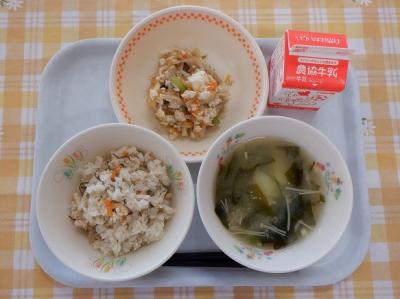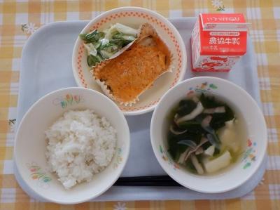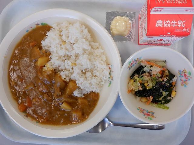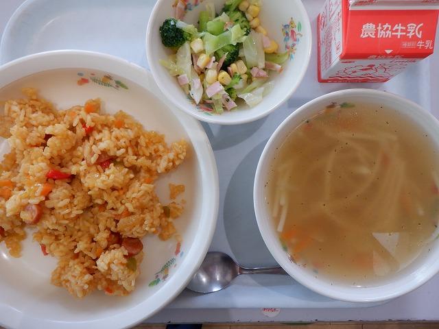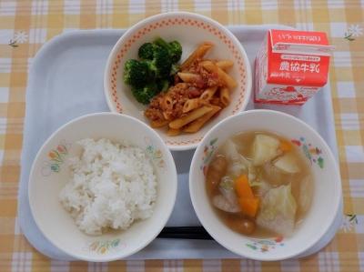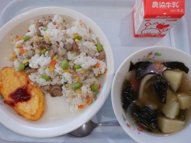 冷凍パンは個包装になっているので、各自でお盆にのせてもらいました。給食当番も早く盛り付けができ、昨日より早く食べ始められました。