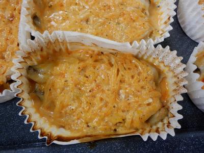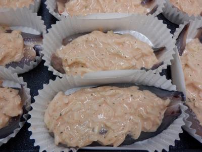 たまねぎ、マヨネーズ、ケチャップなどを合わせたソースを乗せて焼き上げます。