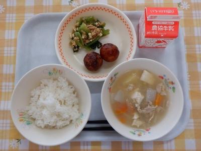 ・しらたま汁(豚肉・しらたま団子・油揚げ・白菜・にんじん・ごぼう入りのボリュームのある汁物でした。)