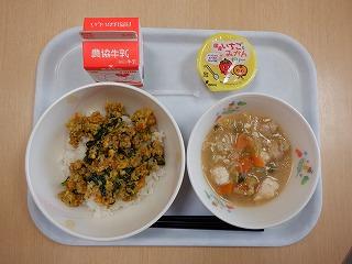 ・そぼろ丼(ひき肉、たまご、たまねぎ、にんじん、さやいんげんが入ったそぼろです。ひき肉とたまごは同量で、しょうがの効いたそぼろで食欲が進みました。)