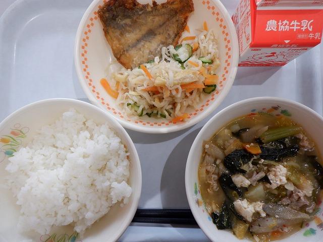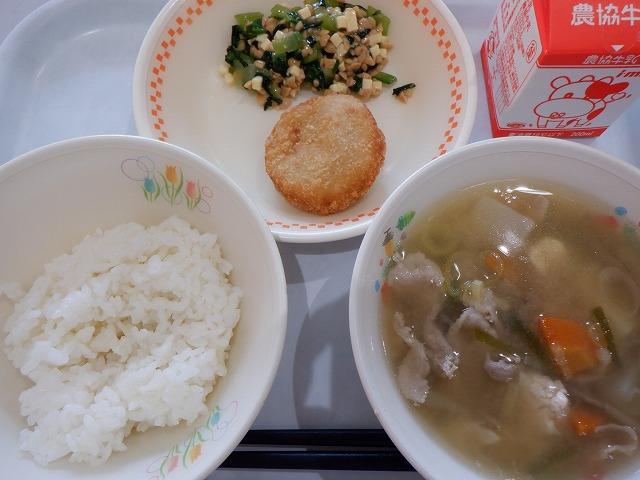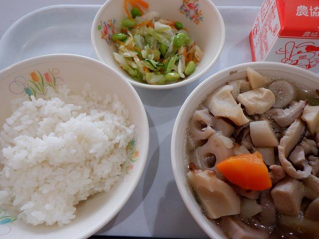 ・具だくさん汁(豚肉・こんにゃく・にんじん・大根・たまねぎ・はくさい・ごぼう・ねぎ入りです。豚汁よりもさらに具が多く、名前通り、たくさんの野菜が入って食物繊維と噛み応え充分の汁物でした。)