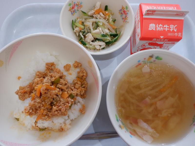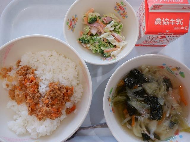・そぼろ丼(ひき肉、たまご、たまねぎ、にんじん、さやいんげんが入ったそぼろです。ひき肉とたまごは同量で、しょうがの効いたそぼろで食欲が進みました。)