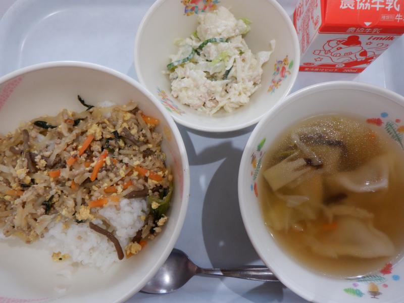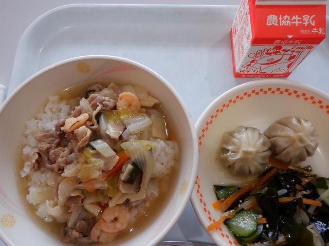 ・中華丼(カレー皿で盛り付ける予定でしたが、お盆のサイズにあわせ、丼鉢になりました。乗せた具が多くなっています。)