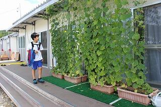 ところが…。数日後、再びグリーンカーテンを見に行くと、葉っぱが虫に食われてヘチマは元気がない状態に。それを見た生徒からは、「かわいそう」「何とかしないと!」との声が。地域の方も気にかけて消毒剤を撒いてくださり、現在、ヘチマは再び元気を取り戻しつつあります。