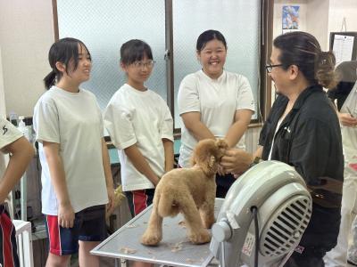 午後は、文京区で職場体験学習が行われました。輪島市では事業所の多くが被災し、例年のような職場体験ができない状況となっていました。その状況をお伝えしたところ、文京区のたくさんの事業所様がご協力くださることになりました。輪島市の中では体験できない職業もあり、充実した体験となりました。東陽中は 「わんわん美容室グランパ 」様にて体験をさせていただきました!かわいいわんちゃん達に癒されながら、トリマーの仕事の面白さややりがい、難しさについて知ることができました。