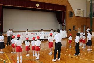 9月28日(日)に開催される小中合同体育祭に向けて、生徒たちは毎日熱心に練習に取り組んでいます。今日は、小学生と合同で「応援合戦」の練習をしました。応援団を中心に気合いのこもった元気な声がグラウンドに響き渡りました。