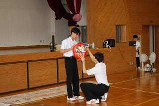町野小学校体育館で、生徒会主催の「小中合同体育祭オリエンテーション」が行われました。体育祭のねらいや種目の確認の後、体育祭のスローガン「心一つに響かせエール!~みんなで広げる笑顔の輪~」が発表され、児童生徒の士気も高まった様子でした。また、体育祭のねらいやスローガン達成を目指して、「だるまの目入れ」も行われました。