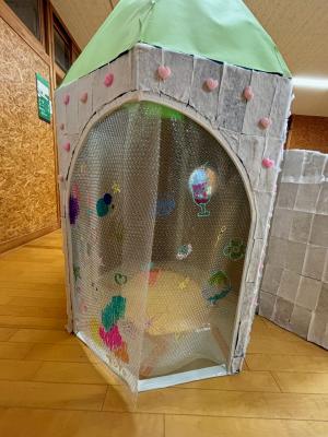 大きなダンボールをもらい、何を作るかみんなで話し合った結果、小さな子から大人まで入ることができ、撮影スポットにもなるかわいいロケットが完成しました。