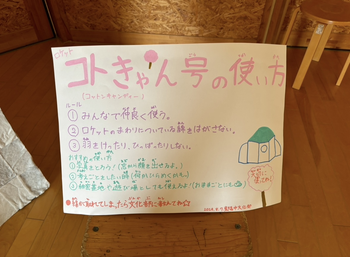 「コトきゃん号」の名前の由来は「コットンキャンディ」です。切ったダンボールの角などでケガをすることがないよう、綿で全体を覆うと、まるで綿あめのようにかわいらしい姿になったことから文化部員が名付けました。