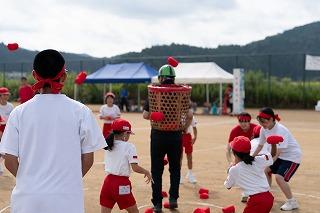 今回は、PTAのお二方に籠を背負っていただき、その籠をめがけて、子ども達が玉を投げ入れました。終了の合図と共に籠の中を見ると、ほぼ同量の玉が入っていて、数を数えるまで結果はわからない状況でした。結果は1回戦・2回戦共に、なんと、「1個差」で赤団が勝利しました!